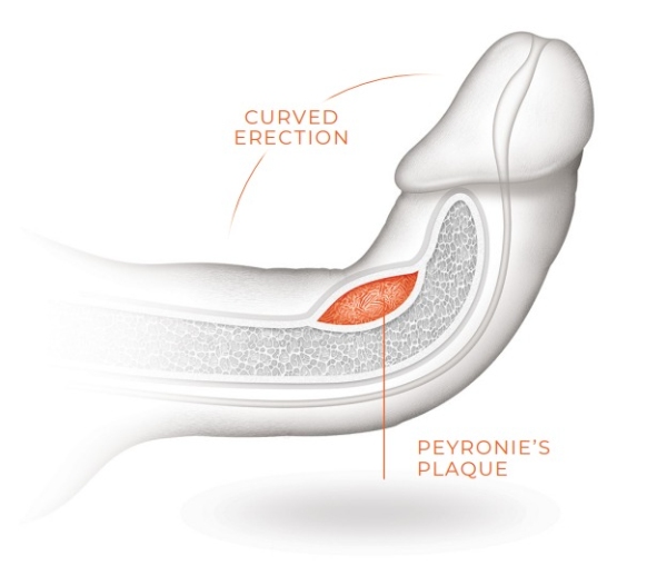 Erectile curvature caused by Peyronie’s disease, or PD, is thought to be the result of a problem in the way the body heals after an injury. The body doesn’t properly control how much scar tissue develops, causing too much to build up over time. This scar tissue forms a bump under the skin of the penis. This bump of scar tissue is called a Peyronie’s plaque. It’s what causes the penis to bend when erect.